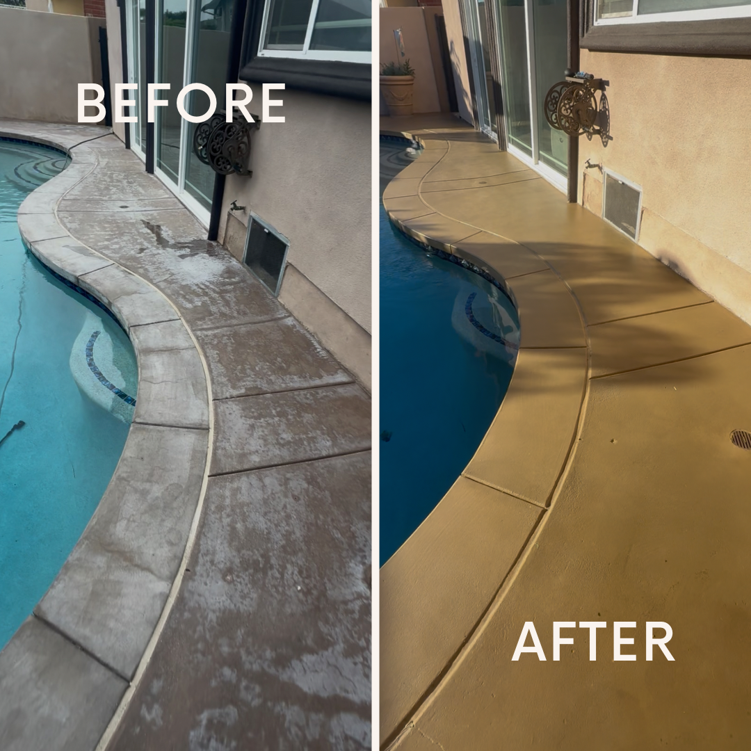 Next, we applied our custom adobe concrete stain, which the customer selected from our 30+ color options, achieving a warm and elegant look that perfectly complemented their outdoor space. Finally, we protected the newly stained surface with a matte concrete sealer, providing long-lasting protection against moisture, UV damage, and daily wear.