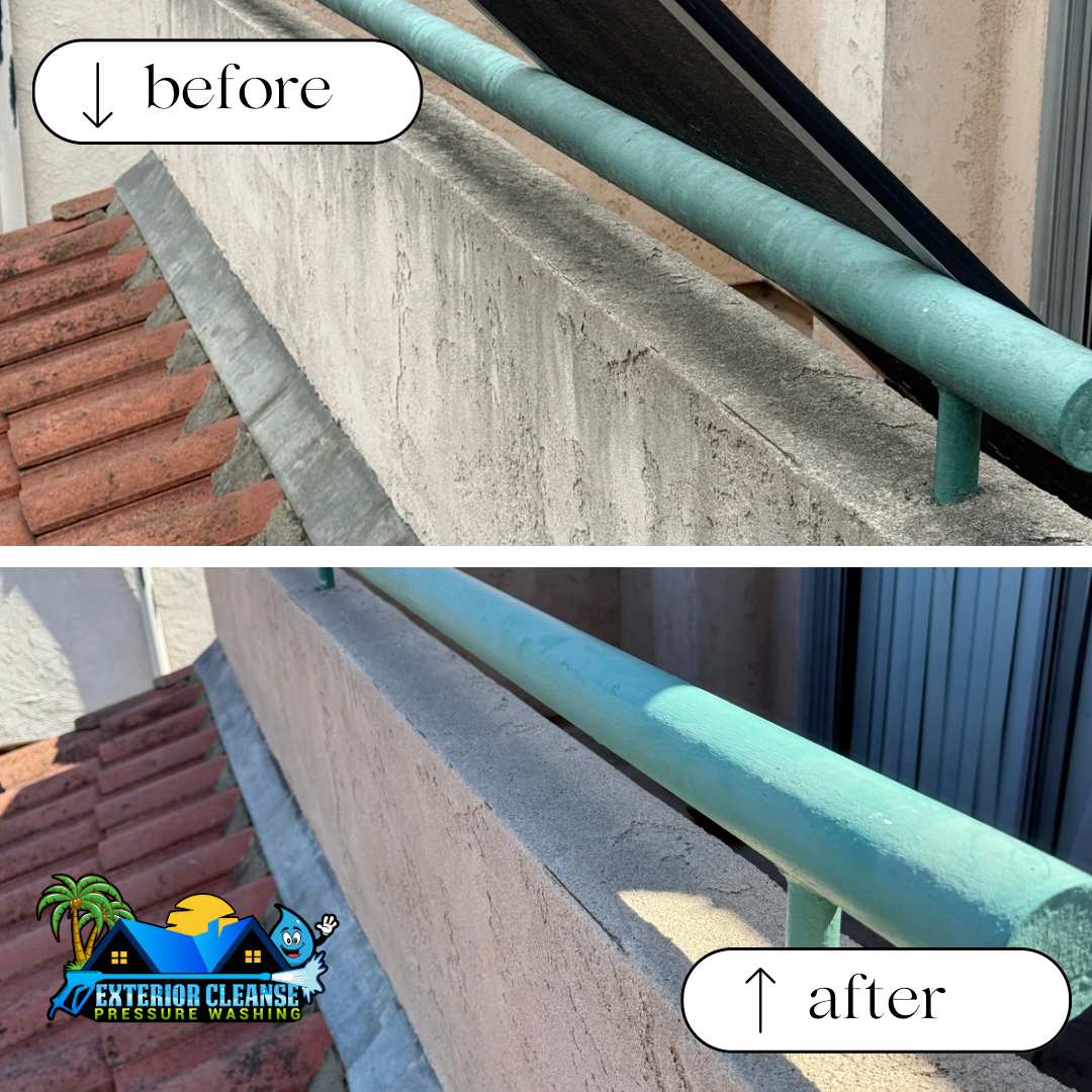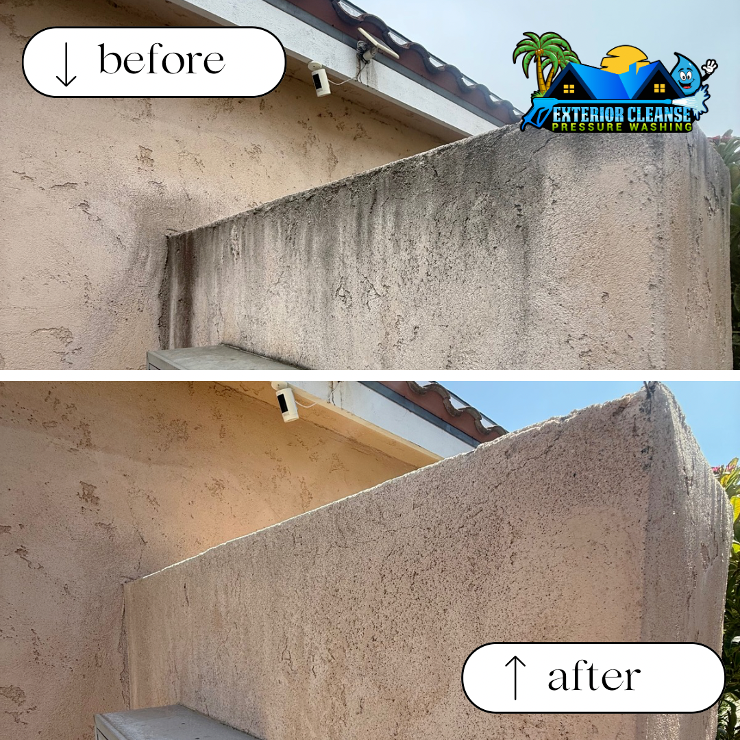 To restore the home, we performed a soft wash house cleaning, a safe and effective method that gently removes algae, dirt, and other contaminants from delicate surfaces like stucco without causing damage. As part of our house wash package, we also completed a full window cleaning, ensuring all dirt and water spots were removed to leave the glass crystal clear.