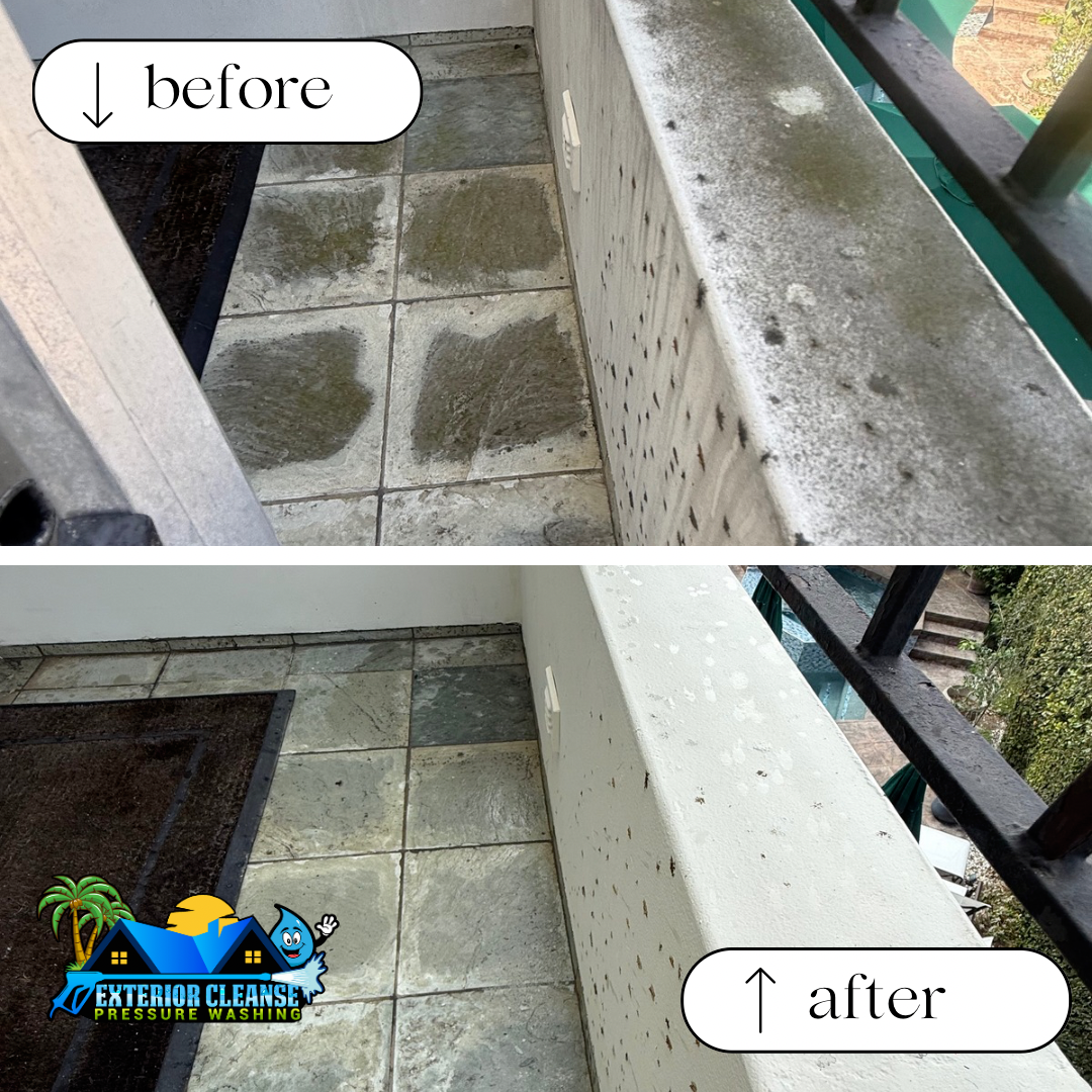 We also performed a complete soft wash house cleaning, focusing on the back of the property where algae had accumulated due to limited sunlight exposure. Using our low-pressure cleaning system and biodegradable cleaning solution, we removed the organic growth and restored the home’s exterior to a bright, clean finish — all without damaging the surface materials.