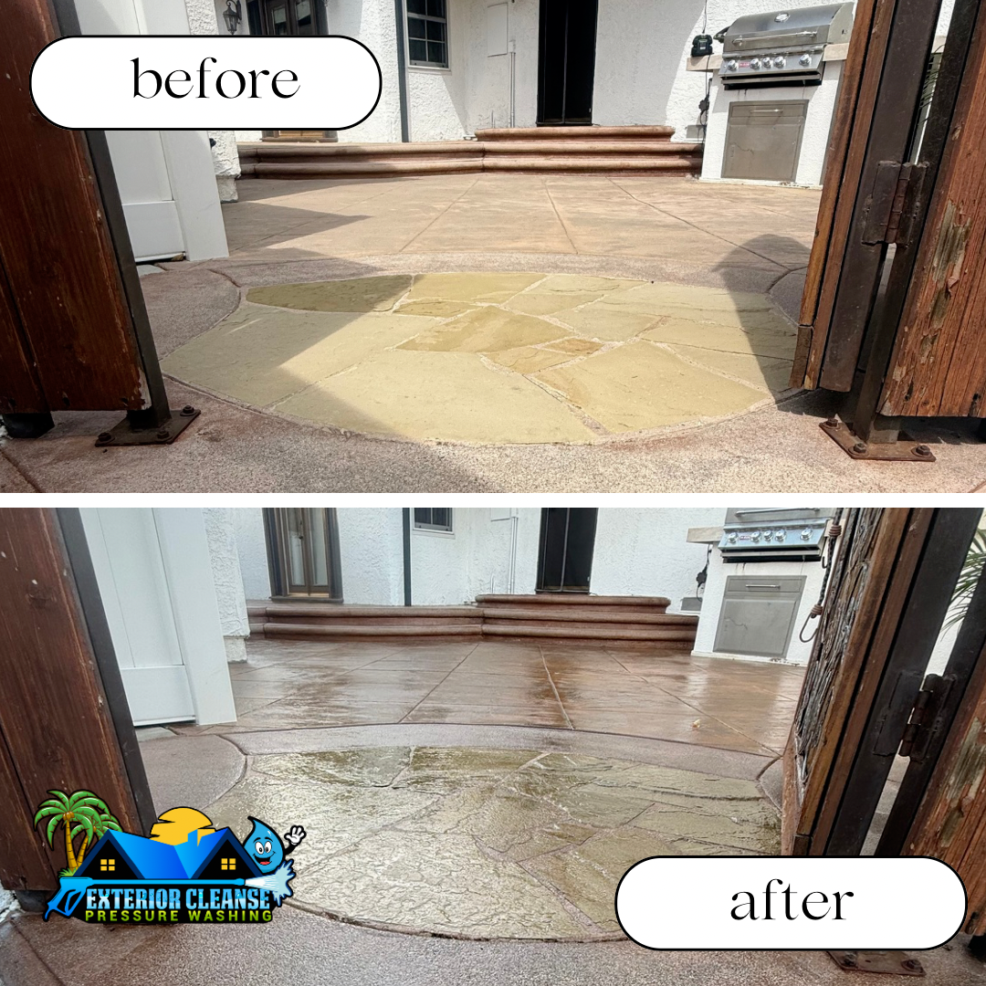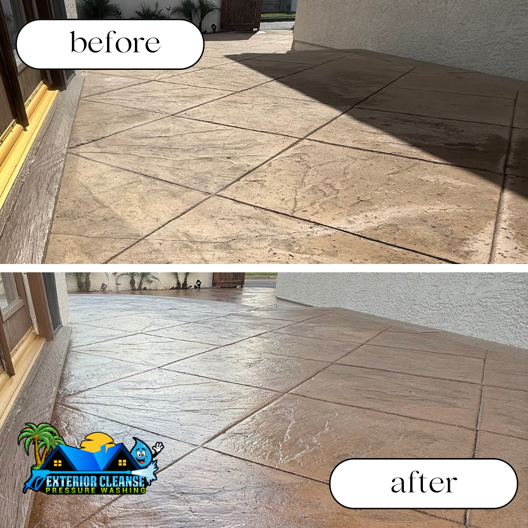 Our team at Exterior Cleanse Pressure Washing stepped in to fully restore the appearance and protection of the patio. We began by thoroughly cleaning the surface to remove dirt, grime, and any existing buildup. Once properly prepped, we applied a high-quality concrete stain to enhance and revive the original color of the stamped concrete.